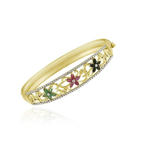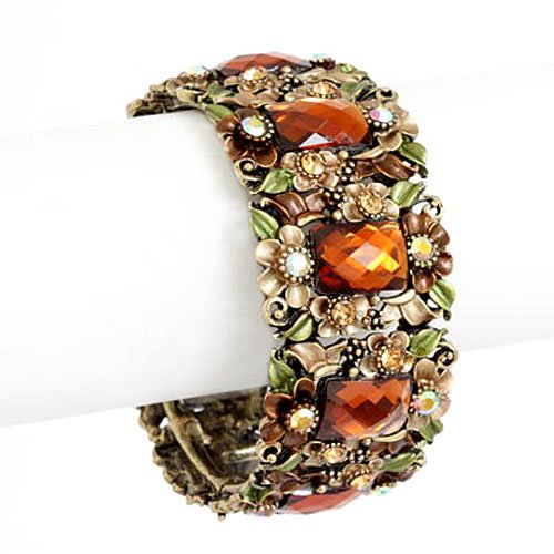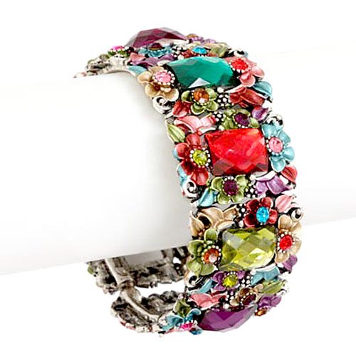 Here is a gorgeous multi colored flower painting and crystal buff bangle bracelet. These big beautiful crystals are surrounded by preciously painted flowers accented with even more crystals. This enchanting piece will complete your look! Will fit up to an 8" wrist comfortably. A perfect item for gift giving or for yourself. Bracelet comes to you in a foil gift box though may be a different box color than the one shown.
